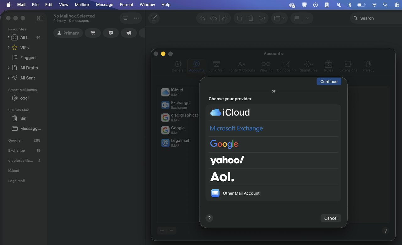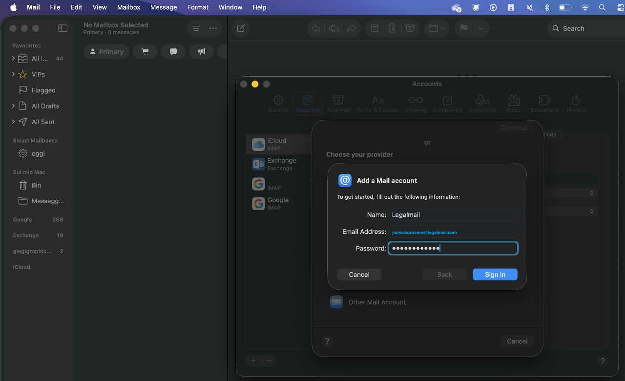 Click the Sign In button to complete the setup. Your PEC mailbox will be configured in the Apple Mail client, allowing you to send and receive certified emails. Finally, the program will prompt you to select the apps with which you want to use the newly created account.