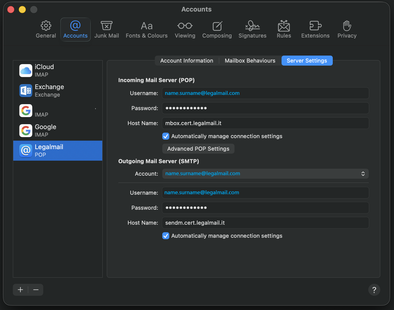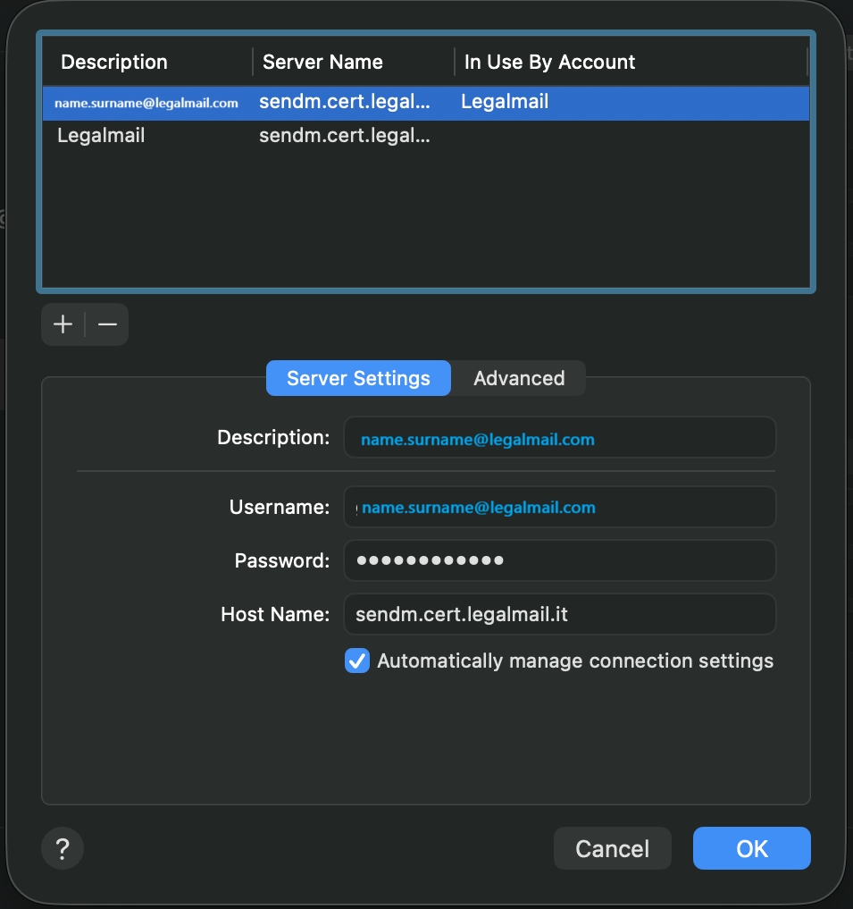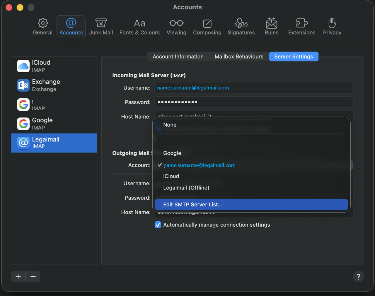 You can also verify the outgoing mail server configuration. The Legalmail mailbox requires the use of the server sendm.cert.legalmail.it, and another option available from the menu is Edit SMTP Server List.