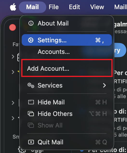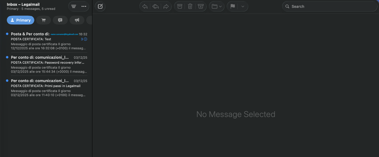 The PEC mailbox will be configured in the Apple Mail client, allowing the user to send and receive certified emails.