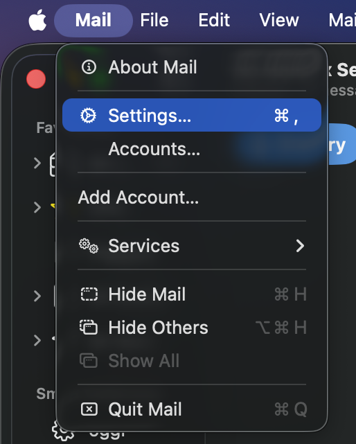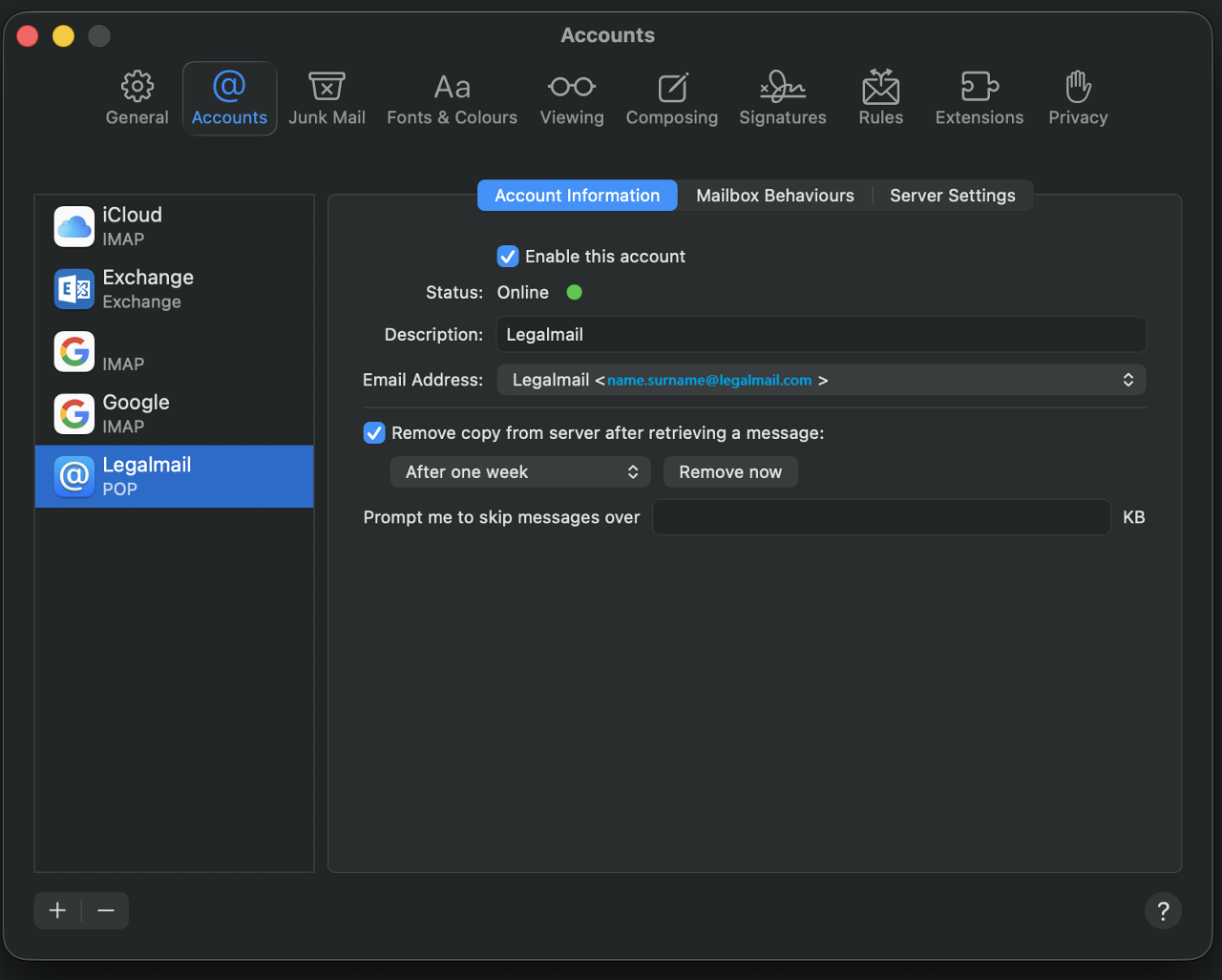 The correctness of the configuration can be checked by selecting Settings from the Mail menu.
