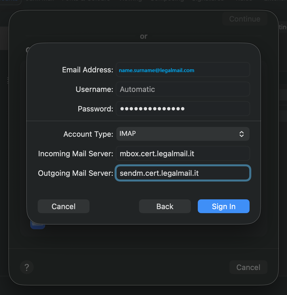 Apple Mail will display a form where you need to enter the information required to configure your PEC mailbox, specifically your email address, Name and your Password.