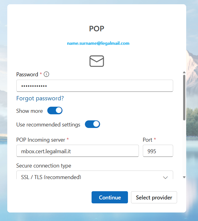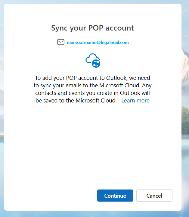 After verifying the password, Outlook will inform you that, in order to configure the POP account, it is needed to sync your emails to the Microsoft Cloud. Click the Continue button, and your mailbox will be fully configured.