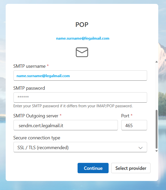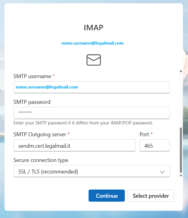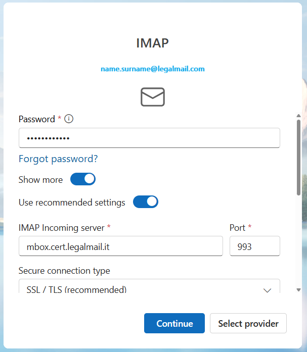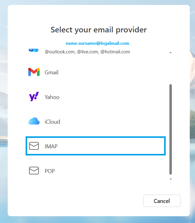 Click the Continue button, scroll down and select IMAP as your email provider.
