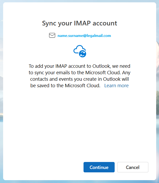 After verifying the password, Outlook will inform you that, in order to configure the IMAP account, it is needed to sync your emails to the Microsoft Cloud. Click the Continue button, and your mailbox will be fully configured,
