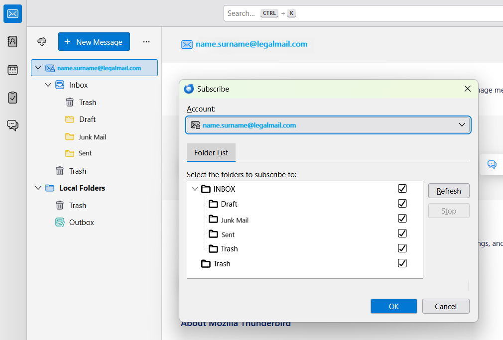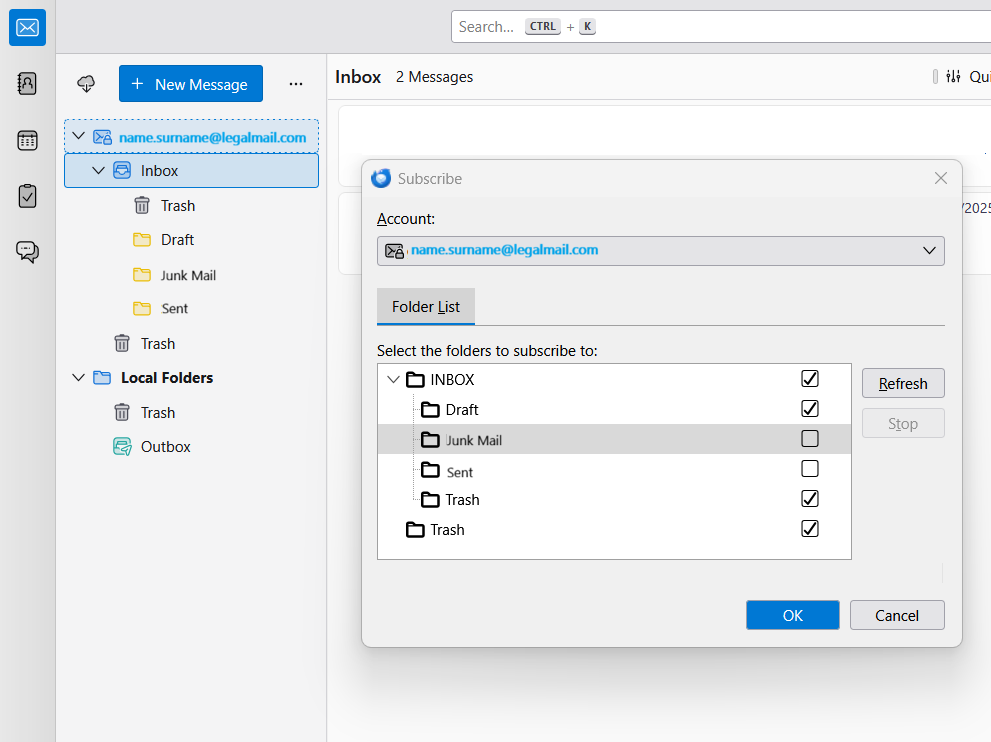 To enable synchronization of the subfolders from the webmail within the client, highlight the mailbox email address, right-click, and then select Subscribe.