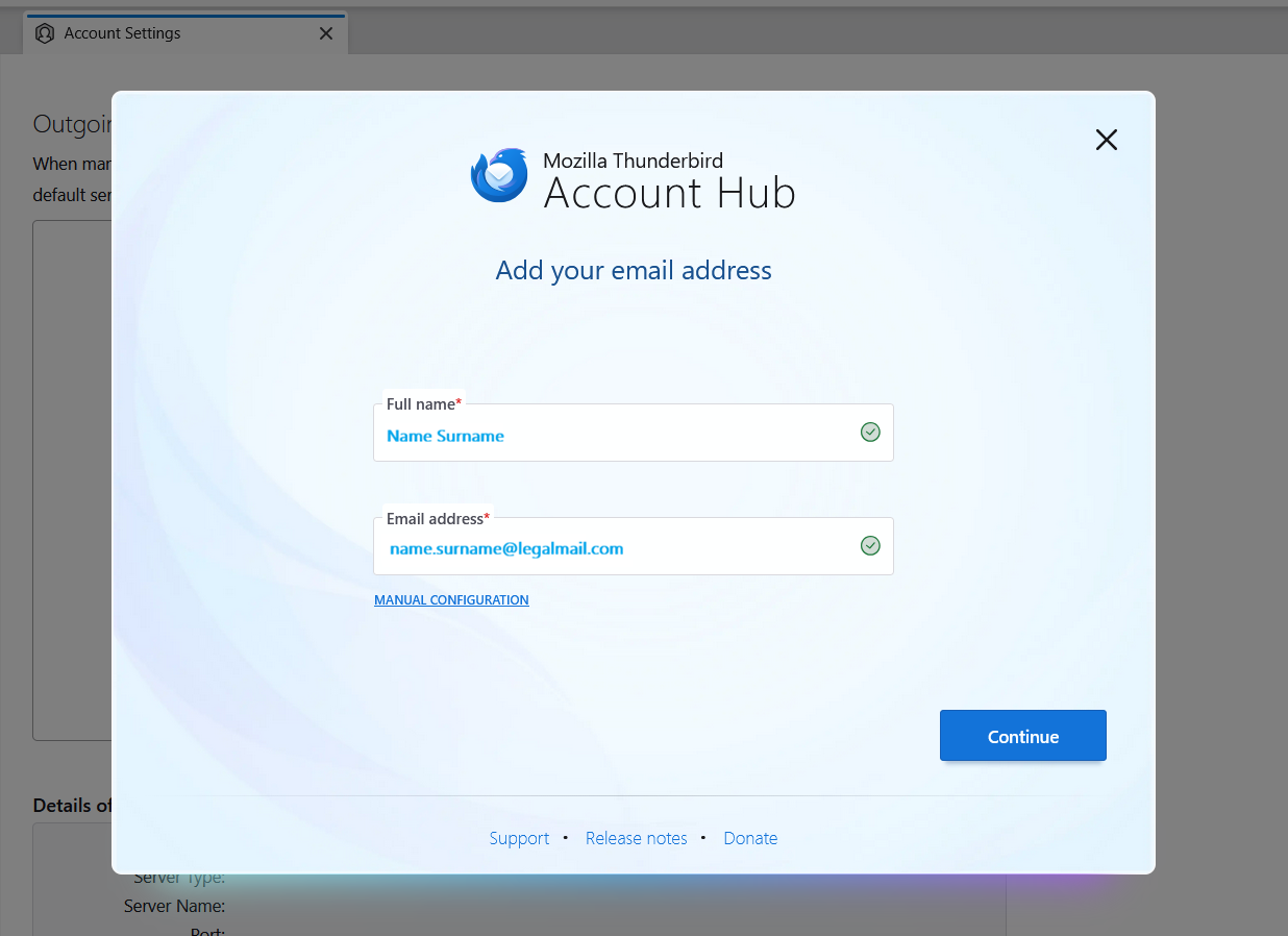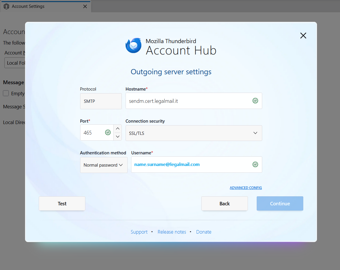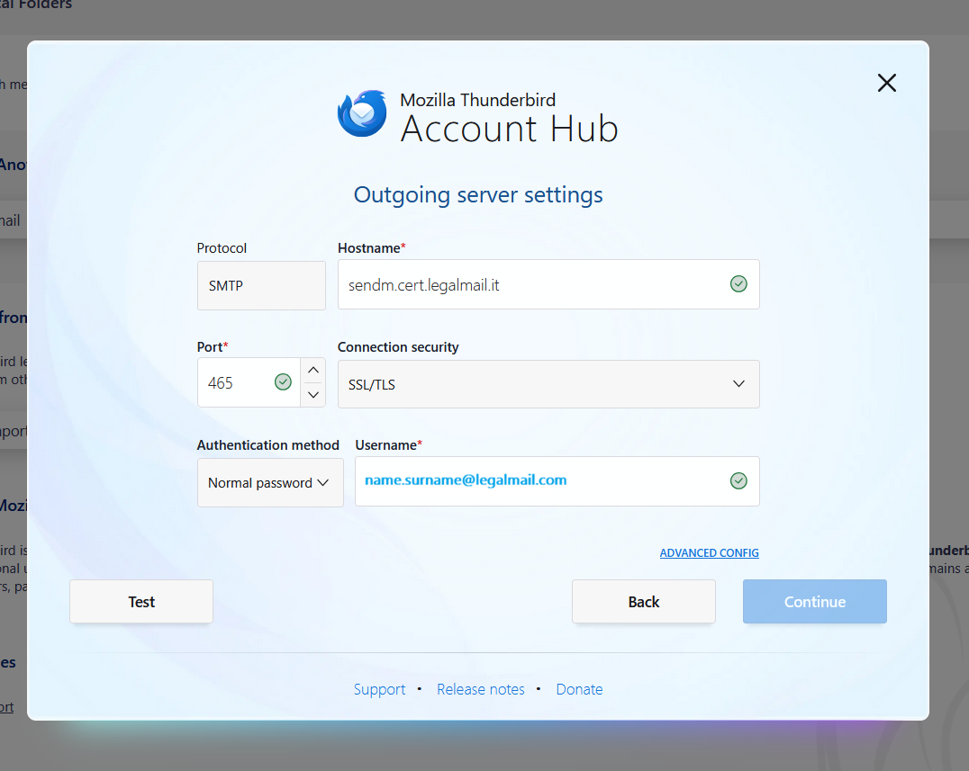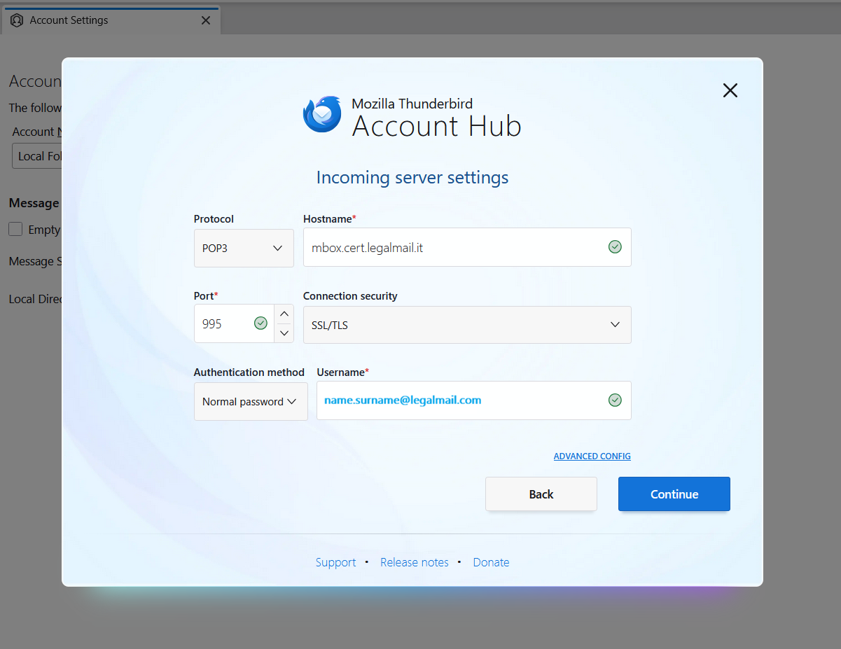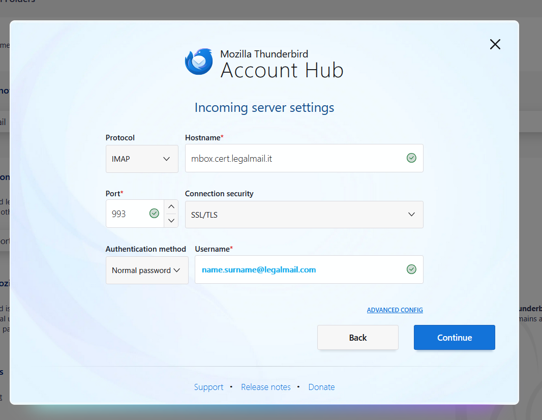 Mozilla Thunderbird will display a form where you need to enter the information required to configure your PEC mailbox, specifically your email address and Name.