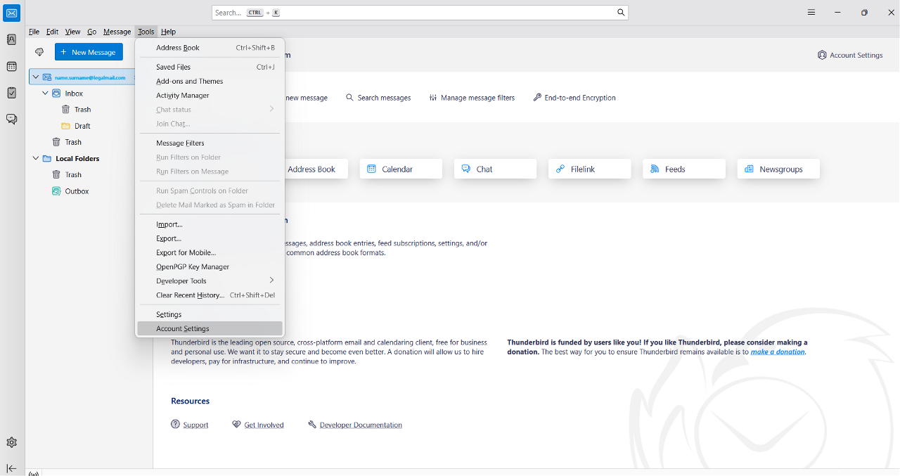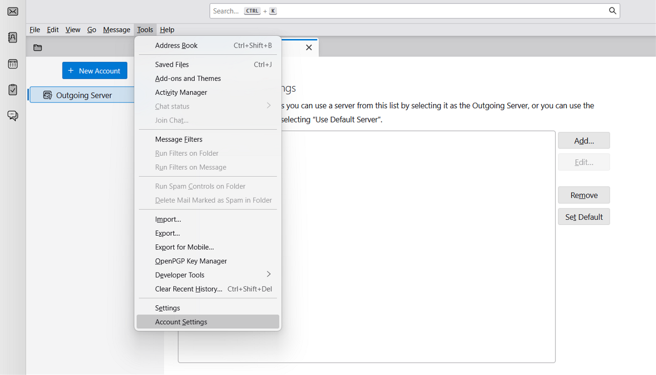 To configure a new email account, select Tools from the menu bar and choose Account Settings.