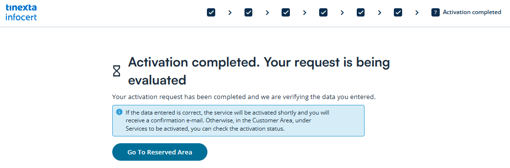 You will then be redirected to the private area of your Tinexta Infocert Account. Click on Go To Reserved Area, to check the activation status of your PEC mailbox.