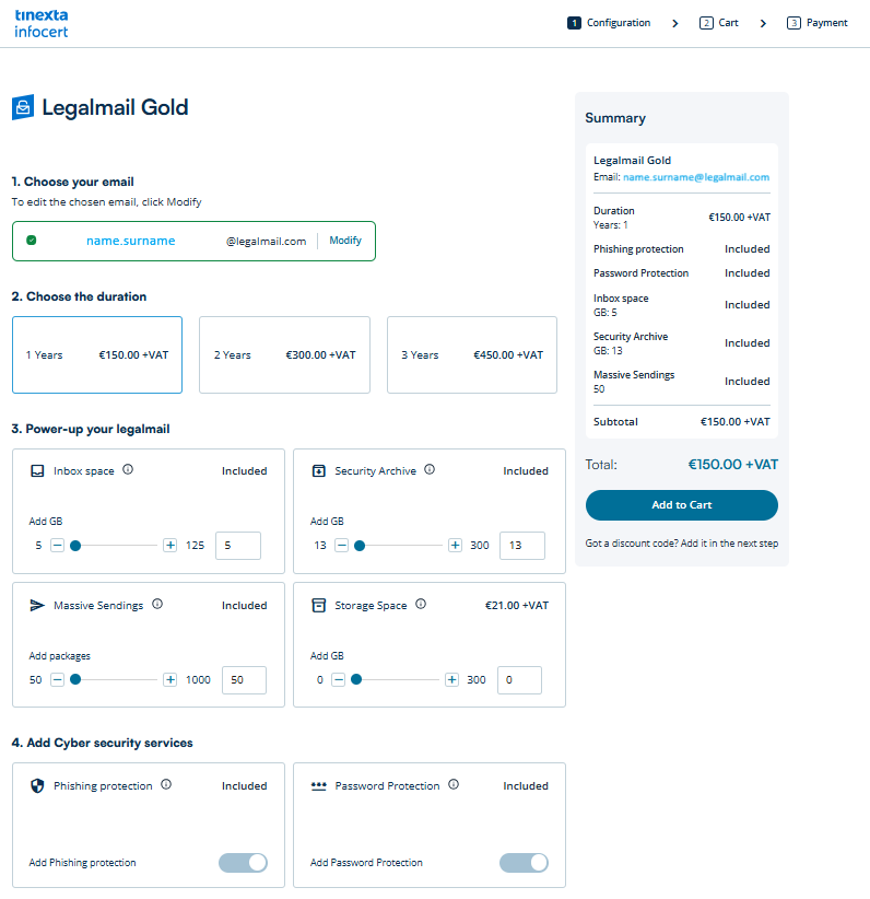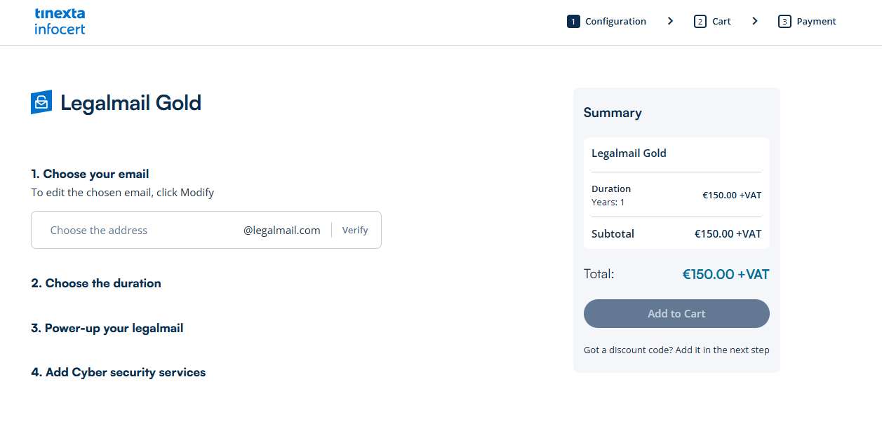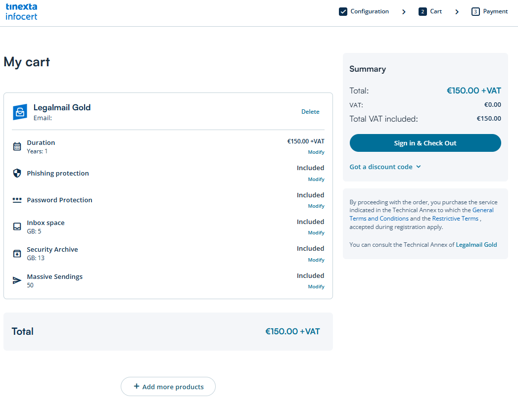 By clicking the Sign in and Check Out button and selecting your preferred payment method (e.g., PayPal, Debit/Credit Card, etc.), you will be asked to create a Tinexta Infocert Account (or log in with an existing one) in order to complete the PEC service order.