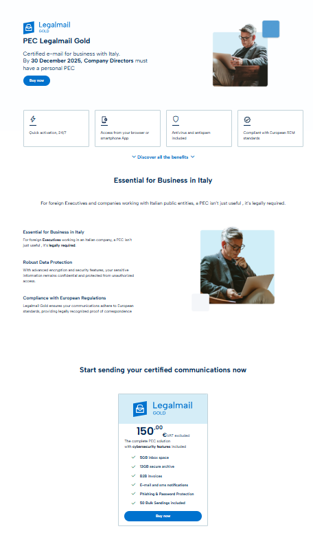 On the Tinexta Infocert international e-commerce select Secure Communication. Choose PEC Legalmail Gold, scroll down the page, and click Buy Now.
