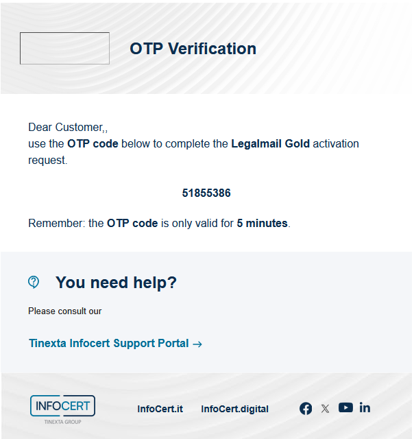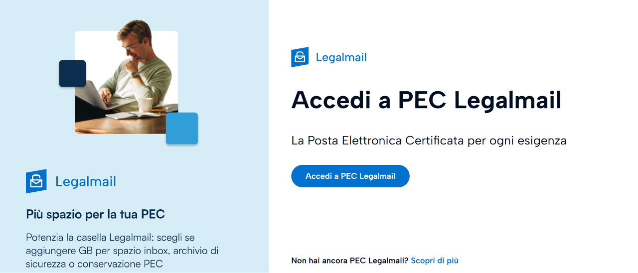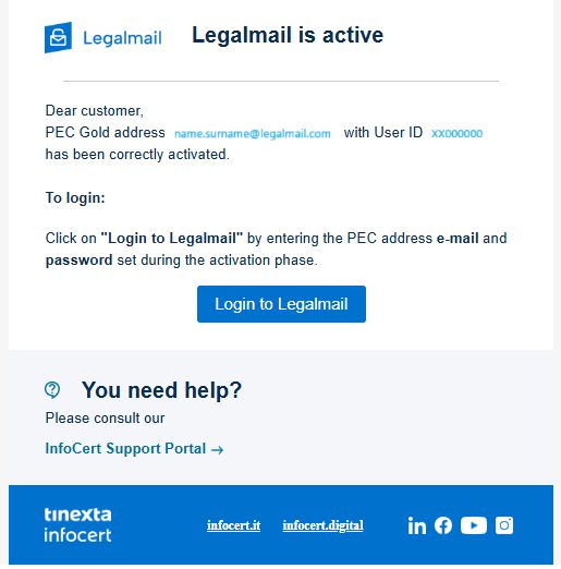 The actual activation of the service is confirmed by receiving an e-mail: Legalmail is active. To log in to your PEC Legalmail Gold, click here.
