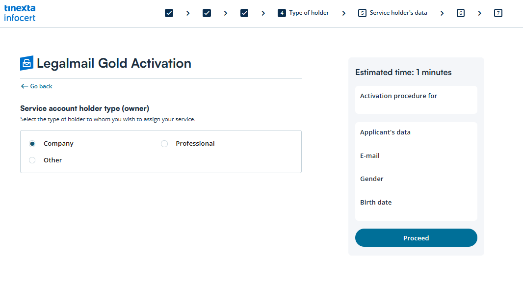 Now, select the type of account holder to whom the PEC Legalmail Gold service will be registered.