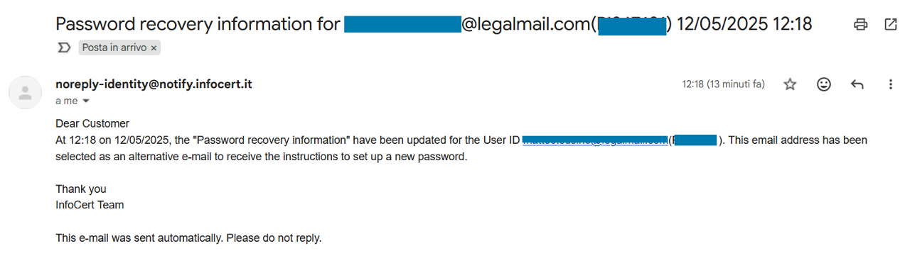Check your email: you should have received a message from "noreplay-identity@notify.infocert.it" informing you that at hh:mm on dd/mm/yyyy your password recovery information was successfully updated.