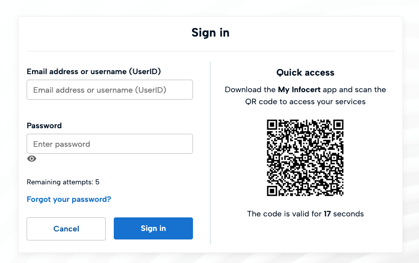 Enter the e-mail and password linked to your Tinexta Infocert Customer Area account and click Log In, or scan the QR code using the My Infocert app.