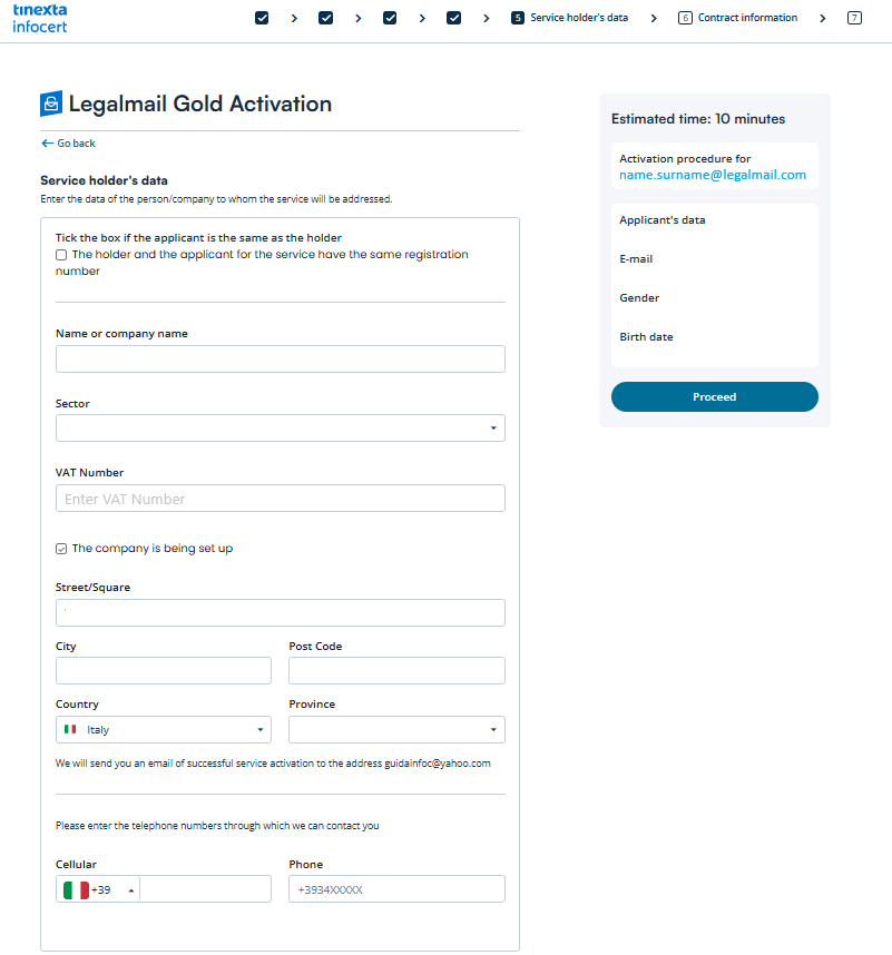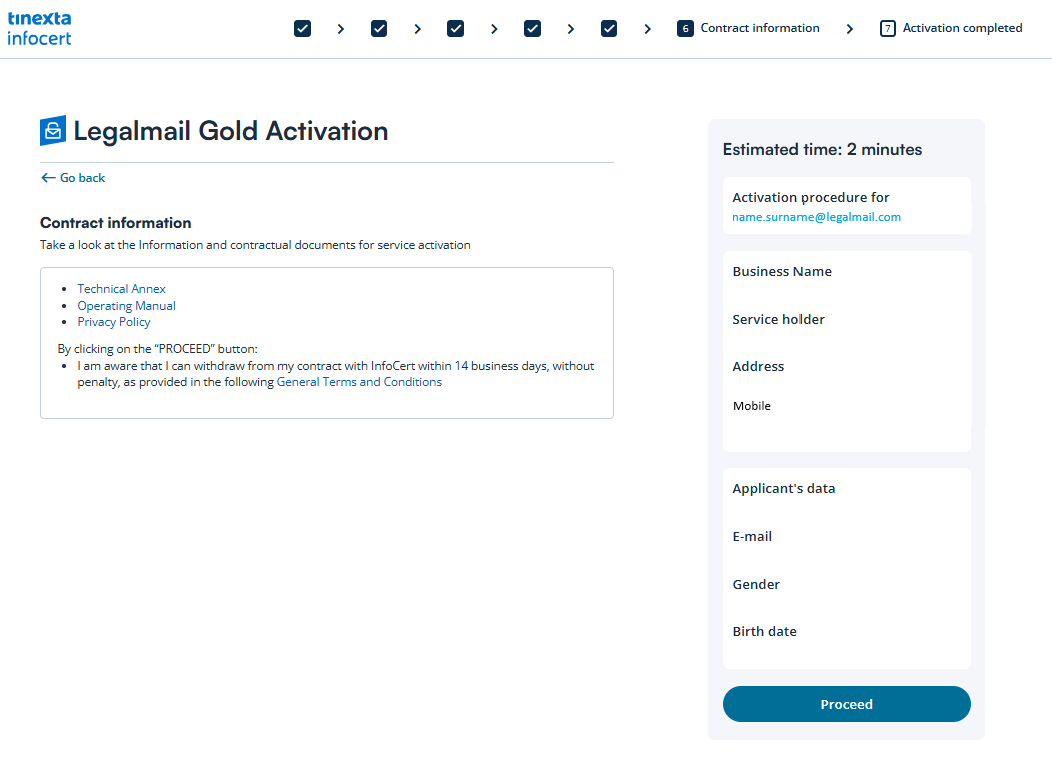 Before completing the activation process, carefully review the information and contractual documents for service activation, then click on Proceed button and continue to the final step.