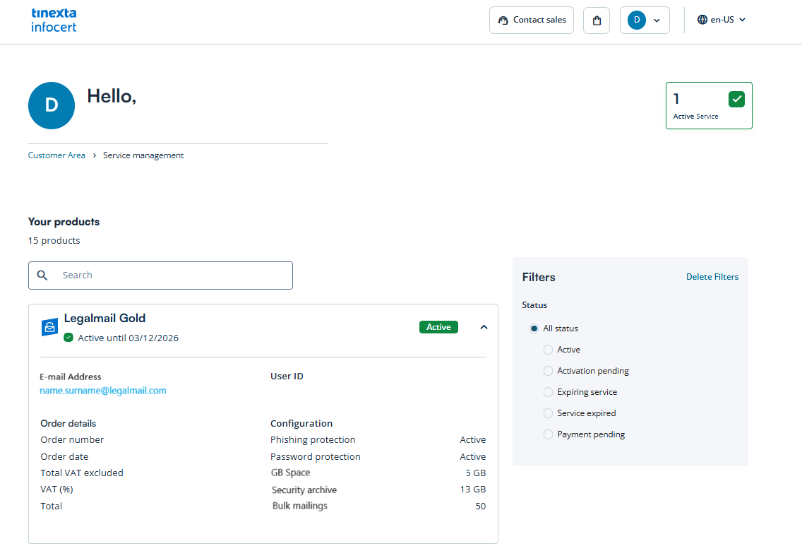 Inside the Service Management section (within the Reserved Area), you will find detailed information about the requested mailbox and its current activation status.
