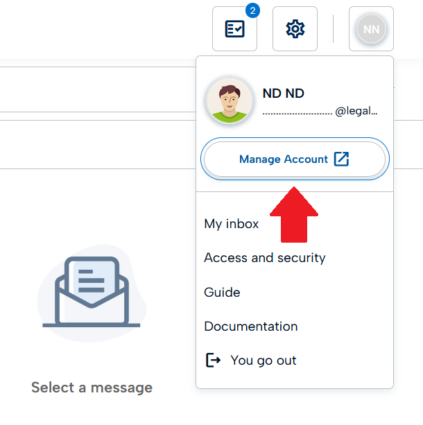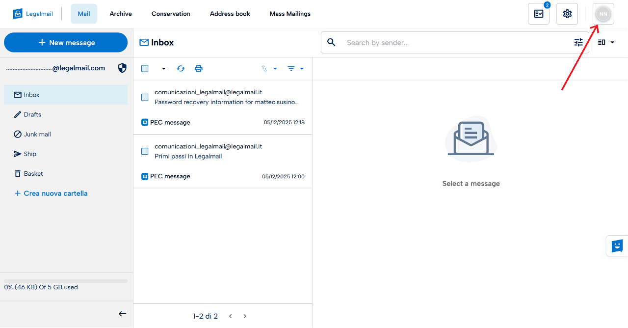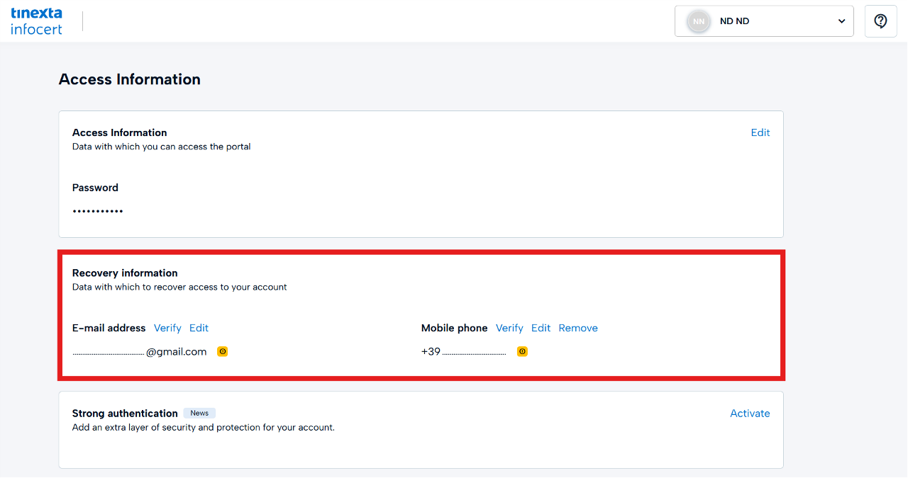In this screen called "My Account" you can proceed with modifying the "Recovery Information" of your Legalmail GOLD PEC mailbox: